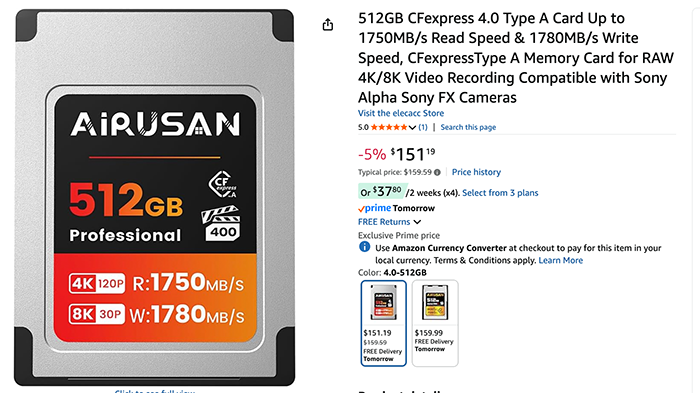Airusan launched their new 512GB VPG400 Type A card on Amazon (Click here). Their previous generation cards have not been officially tested and approved by the CF association. So I don’t know if this card really meets the VPG400 standard. If they keep their promise, this would be the most affordable VPG400 Type A card on the market.