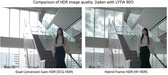 Hybrid Frame-HDR (HF-HDR) is an HDR technology that composites frames captured in short exposures with DCG data on a post-processing application processor. HF-HDR significantly improves the dynamic range compared to conventional HDR technology, delivering performance of over 100 dB.*3 This significantly suppresses highlight blowout in bright areas, as well as blackout in dark areas, delivering images that more closely resemble what the human eye actually sees.*3 Effective in 16-pixel additive mode.