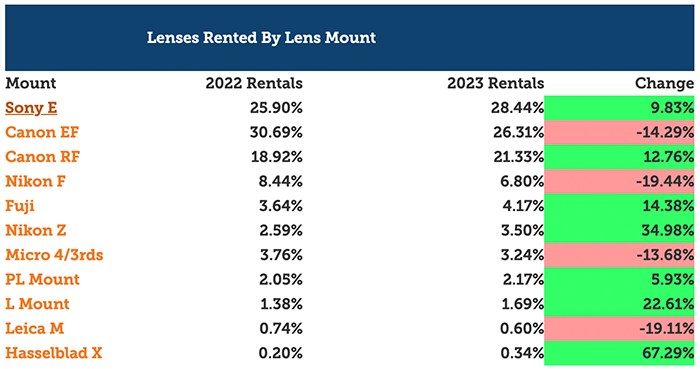2023 report by Lensrentals: Sony E-mount cameras and lens rent numbers increased