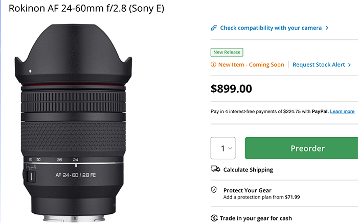 The new Schneider-Rokinon 24-60mm FE lens is now available for preorder at BHphoto (Click here). In Europe at Fotokoch, Fotoerhardt.