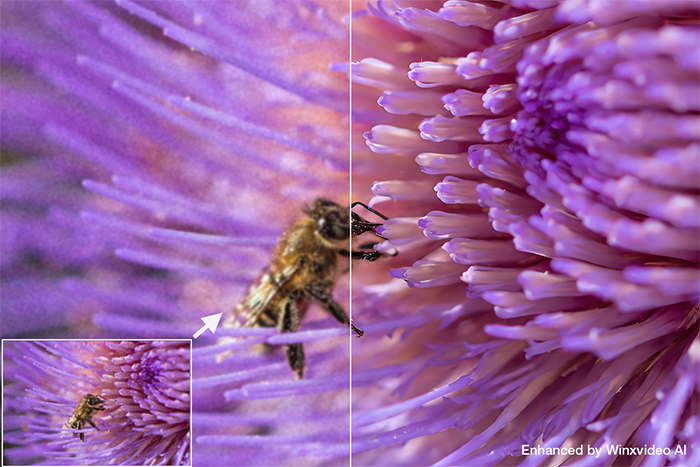 Image showcase 1: A Sony RAW file upscaled to 10K via GenDetail V3, revealing the bee’s delicate antennae and intricate floral veins with lifelike clarity.