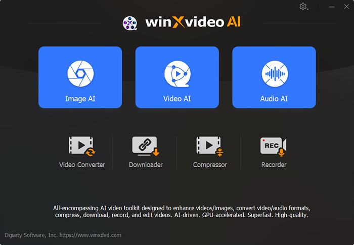 Winxvideo AI isn’t a one-trick pony; it’s a full “Image + Video + Audio” toolkit that combines cutting-edge AI enhancement tools with a professional-grade converter, compressor, downloader, recorder, and editor.