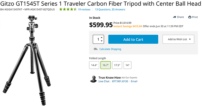 Runs til June 30 at BHphoto: $415 off on the Gitzo Traveler Carbon Fiber Tripod with Center Ball Head