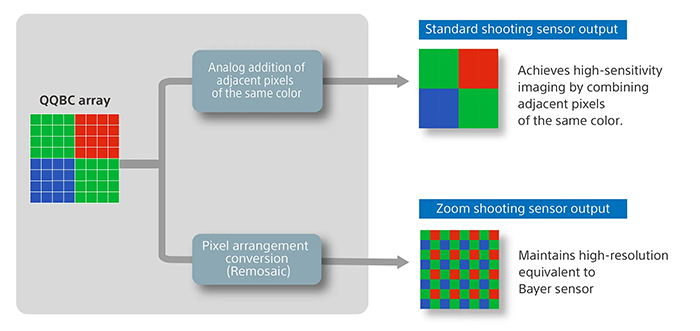 - To leverage the high resolution of approximately 200-effective megapixels, the new product employs a Quad-Quad Bayer Coding (QQBC) array in which 16 (4×4) adjacent pixels are clustered with filters of the same color. During normal shooting, the signals of the 16 clustered pixels are processed as a single pixel unit, allowing the camera to maintain high sensitivity even at night and in dim indoor shooting conditions. On the other hand, during zoom shooting, a form of array conversion processing known as remosaicing reverts the clustered pixels to a normal pixel array, to deliver high-resolution imaging.